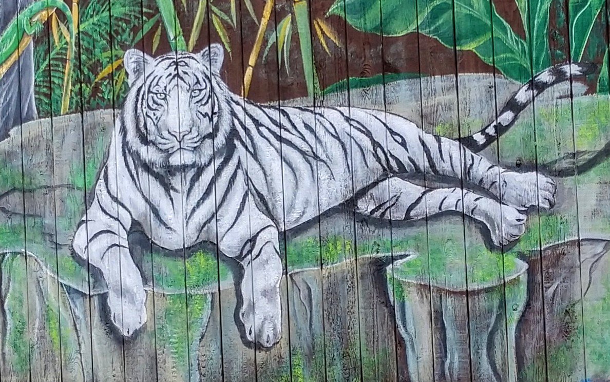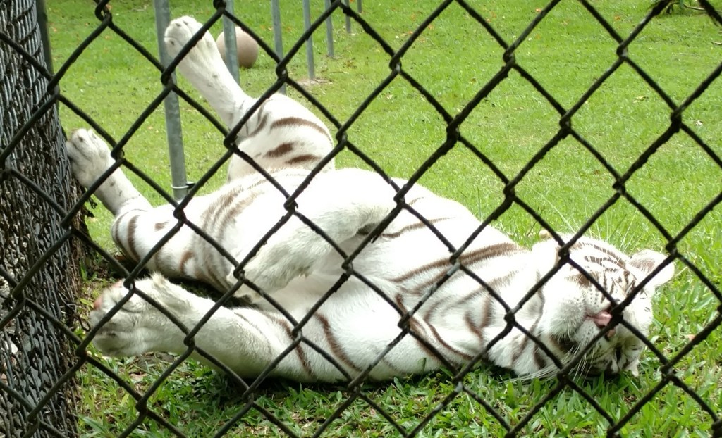 Tzatziki, the zoo’s White Bengal Tiger rolls on his back like a puppy. He shares his enclosure with Sriracha, a female Orange Bengal Tiger. Both were brought to the zoo as cubs.