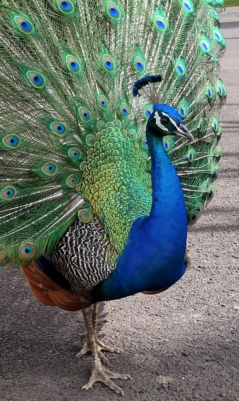 Tame peafowl roam the park freely. The males show off their vibrant plumage to attract a mate.
