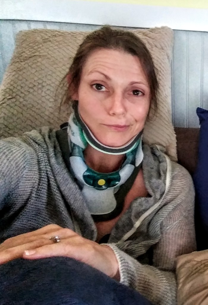 The pressure immediately began to build in my neck and at the base of my skull. I was also having difficulty swallowing and speaking, feeling constriction in my throat and pain to my trachea. The initial jolt of searing pain that shot down my spine in the water was now resolving into a radiating burn. We slowly and very cautiously ambled to the parking lot after my friend convinced me that I was in no shape to drive, and she took me to the nearest emergency room. With advise from my wonderful husband who had received training in emergency field medicine in the Marines, we placed a tennis shoe on either side of my neck with the opening facing forward and wrapped my head with a towel, thereby securing my head and neck for the ride, but also bringing some comfort with the slight pressure. The pain was increasing.